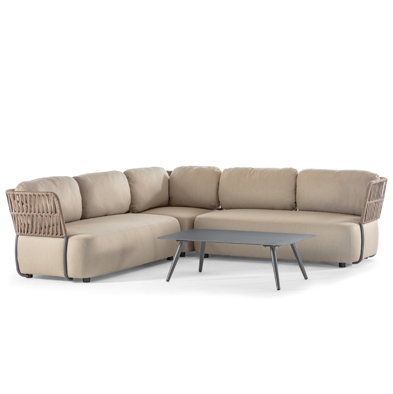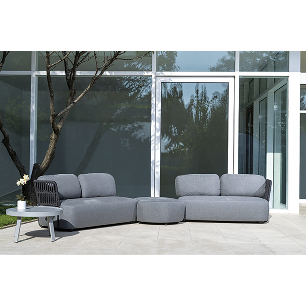 Set din aluminiu cu două canapele de doua locuri acoperite cu poliolefina și frânghie de cauciuc, un element de colt,  și o masă cu blat din aluminiu. Perne tapitate cu material acrilic și cauciuc rezistent la apa.